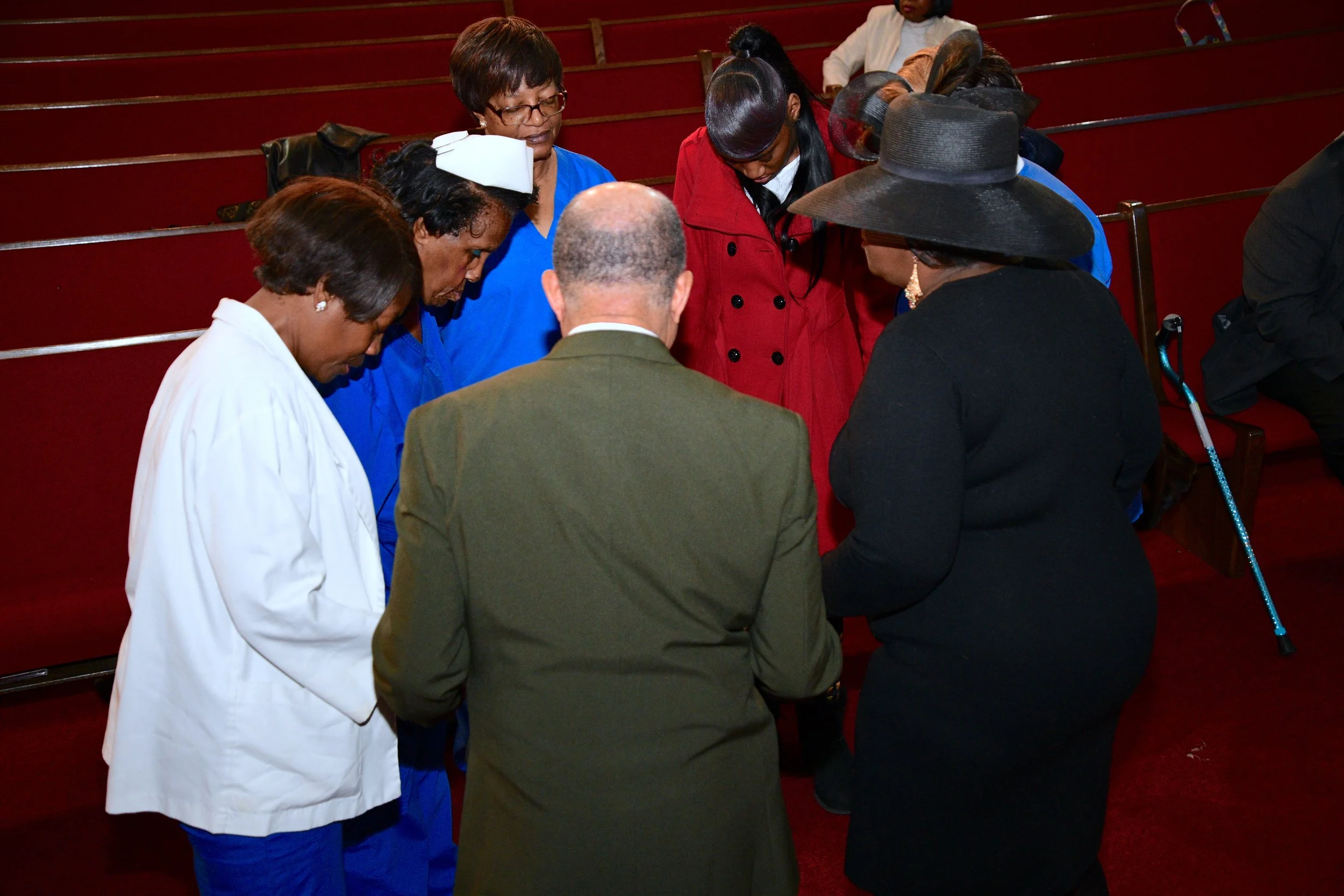 Group of healthcare workers and visitors praying together in a church setting.