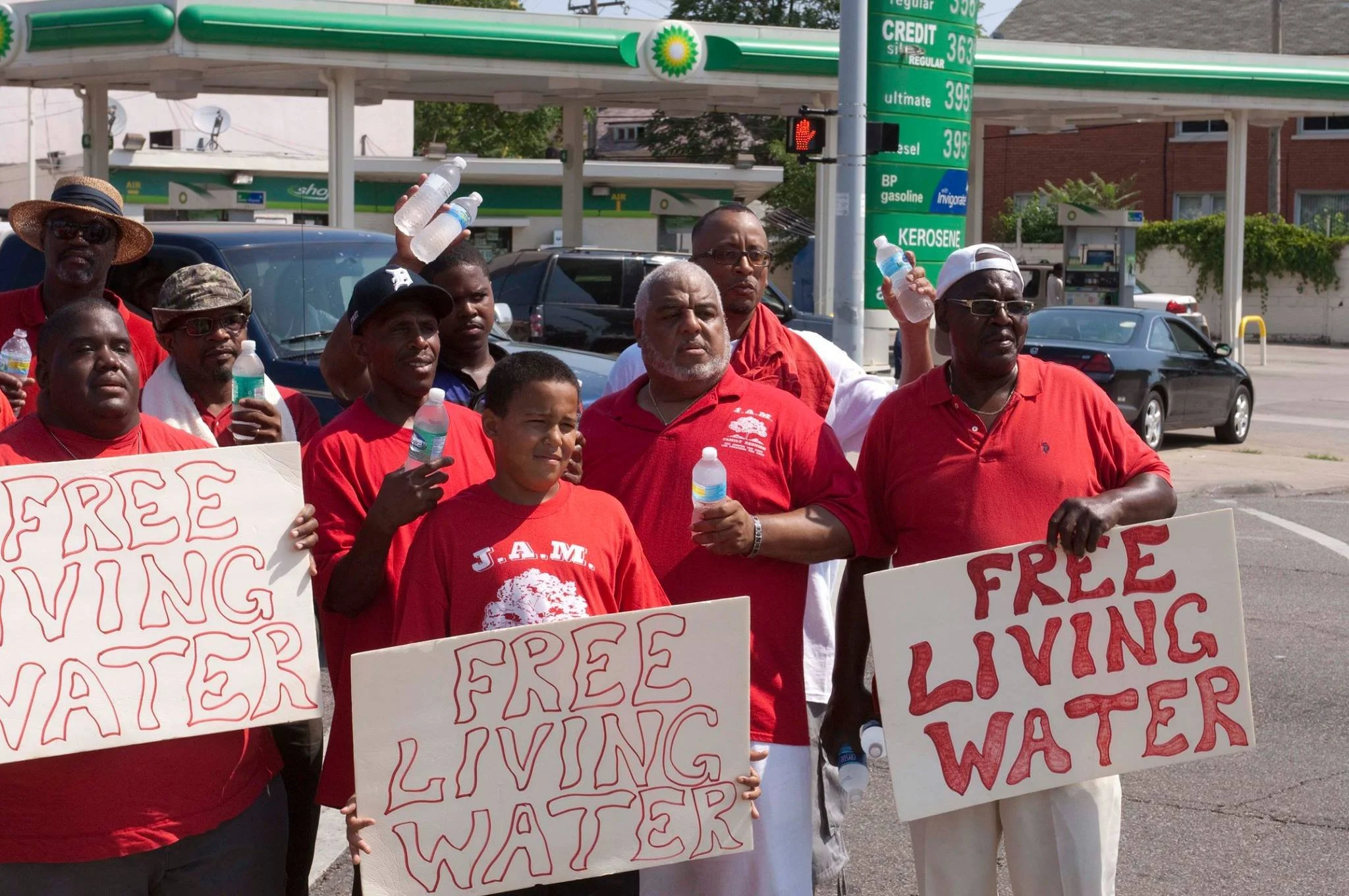 Group of people protesting for free living water, holding signs that read "FREE LIVING WATER" and bottles of water, standing by a petrol station on a street.
