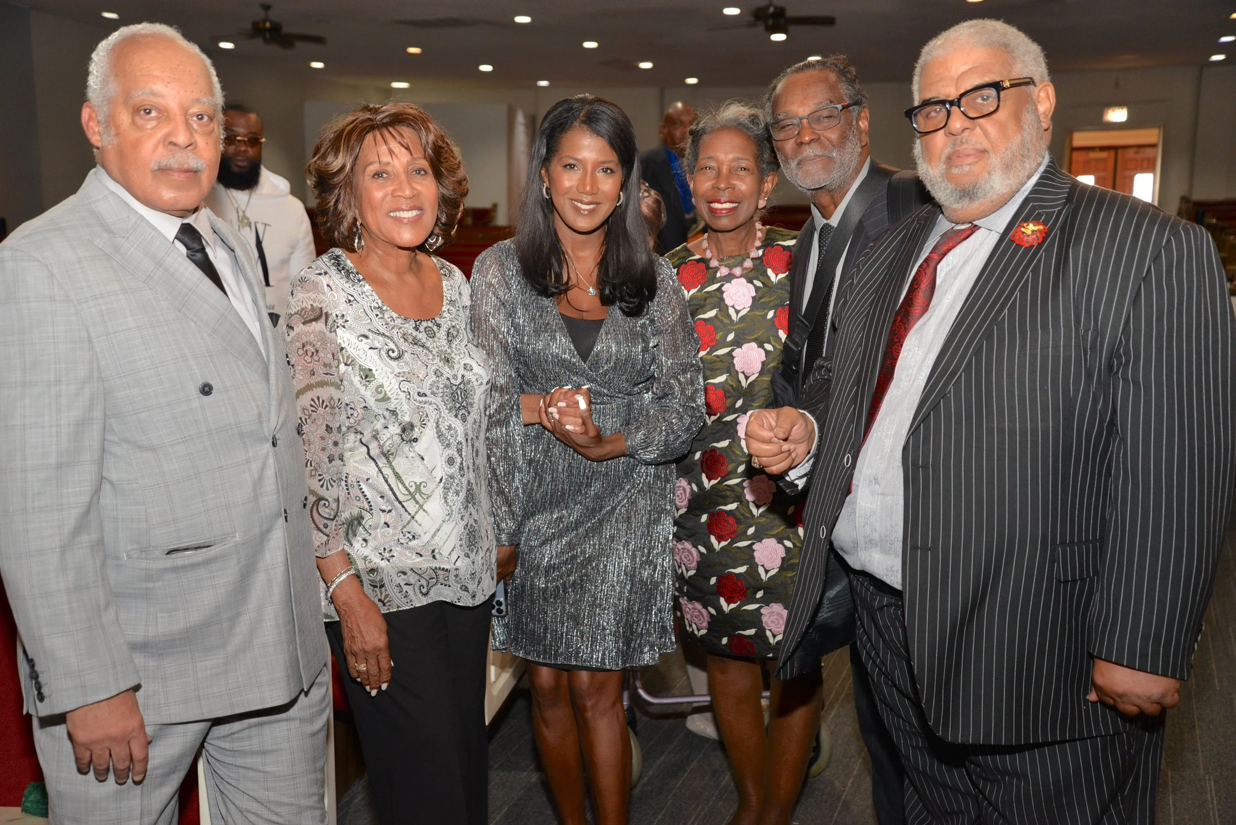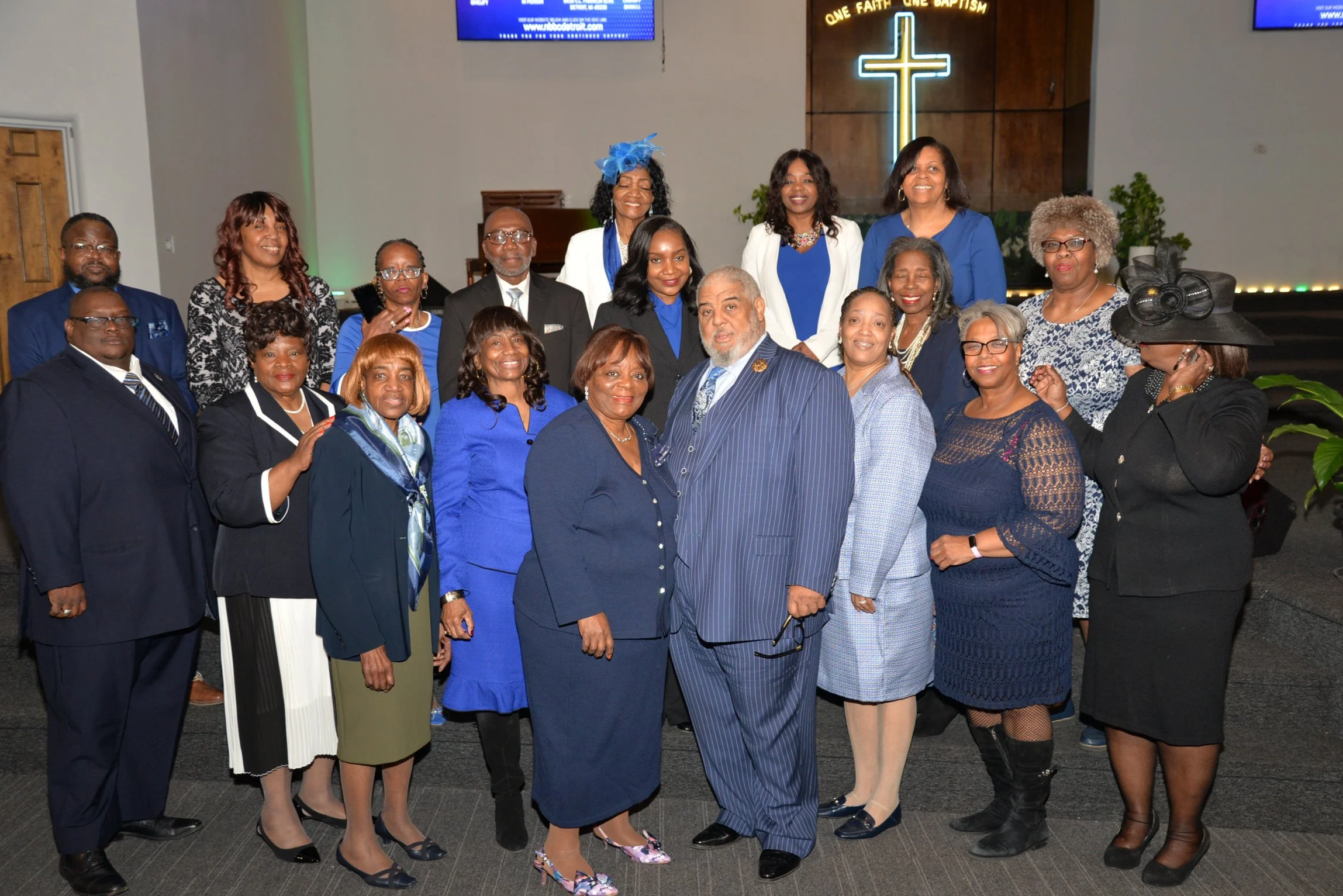 Group of diverse people in formal attire gathered inside a church with a cross and a blue digital screen in the background.