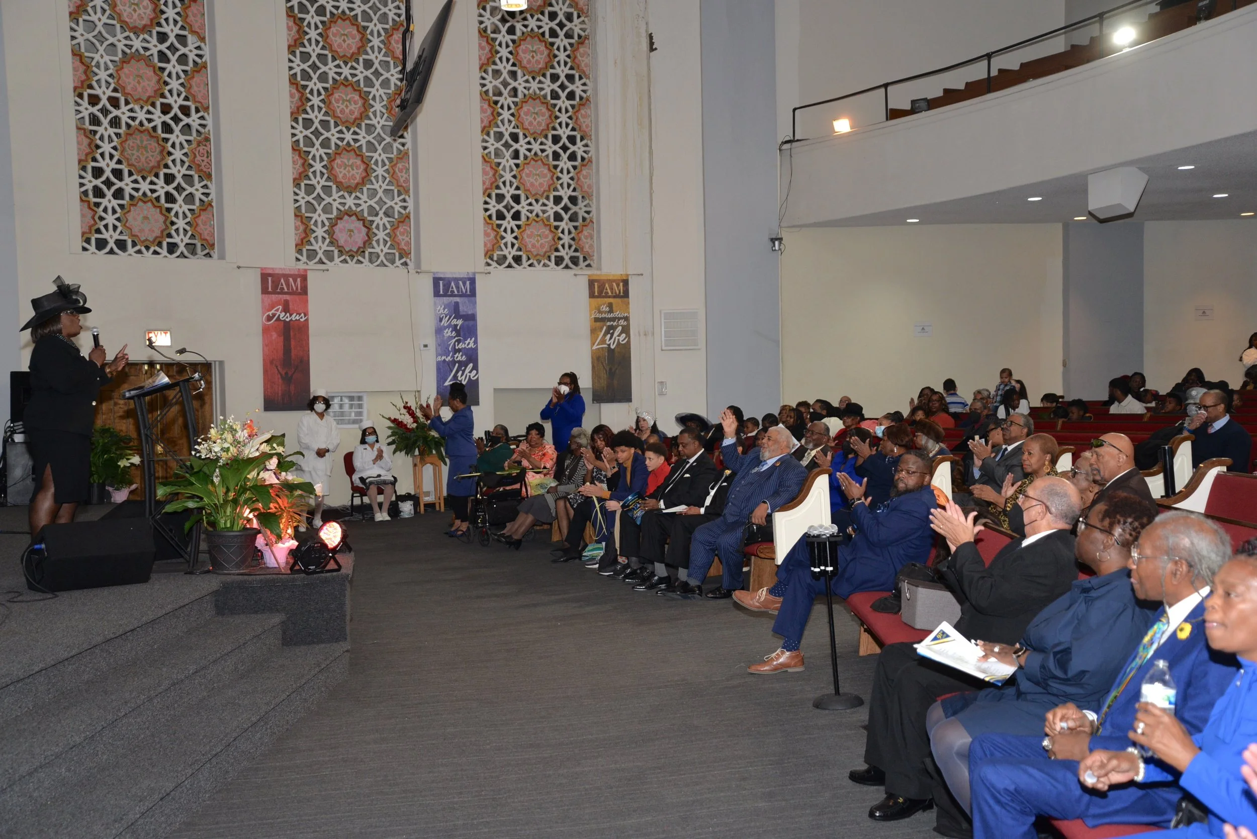A woman speaking at a church service or conference, with the audience seated and listening attentively. The setting features banners that read 'I AM Jesus,' 'I AM the Way, the Truth, and the Life,' and 'I AM the Resurrection and the Life.' The audien