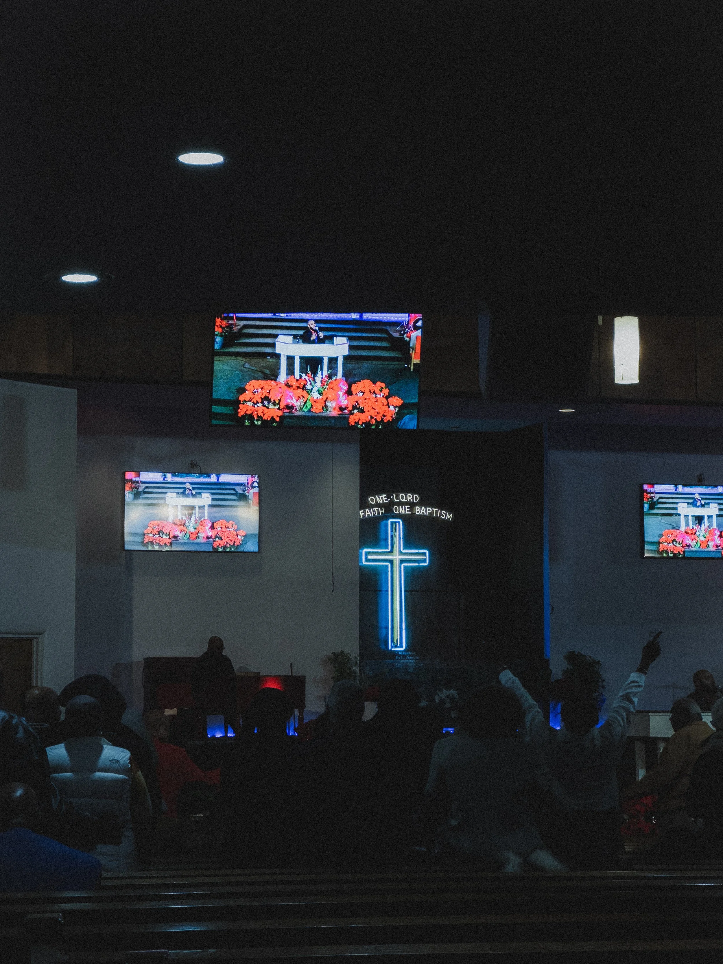 Church congregation attending service with screens displaying a preacher and a neon cross on altar.