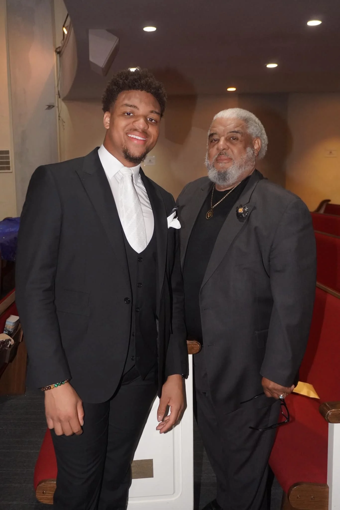 Two men standing inside a church, one young man on the left wearing a black suit, white shirt, and light-colored tie, and an older man on the right with gray hair and beard wearing a black suit and shirt. They are smiling and standing close together.