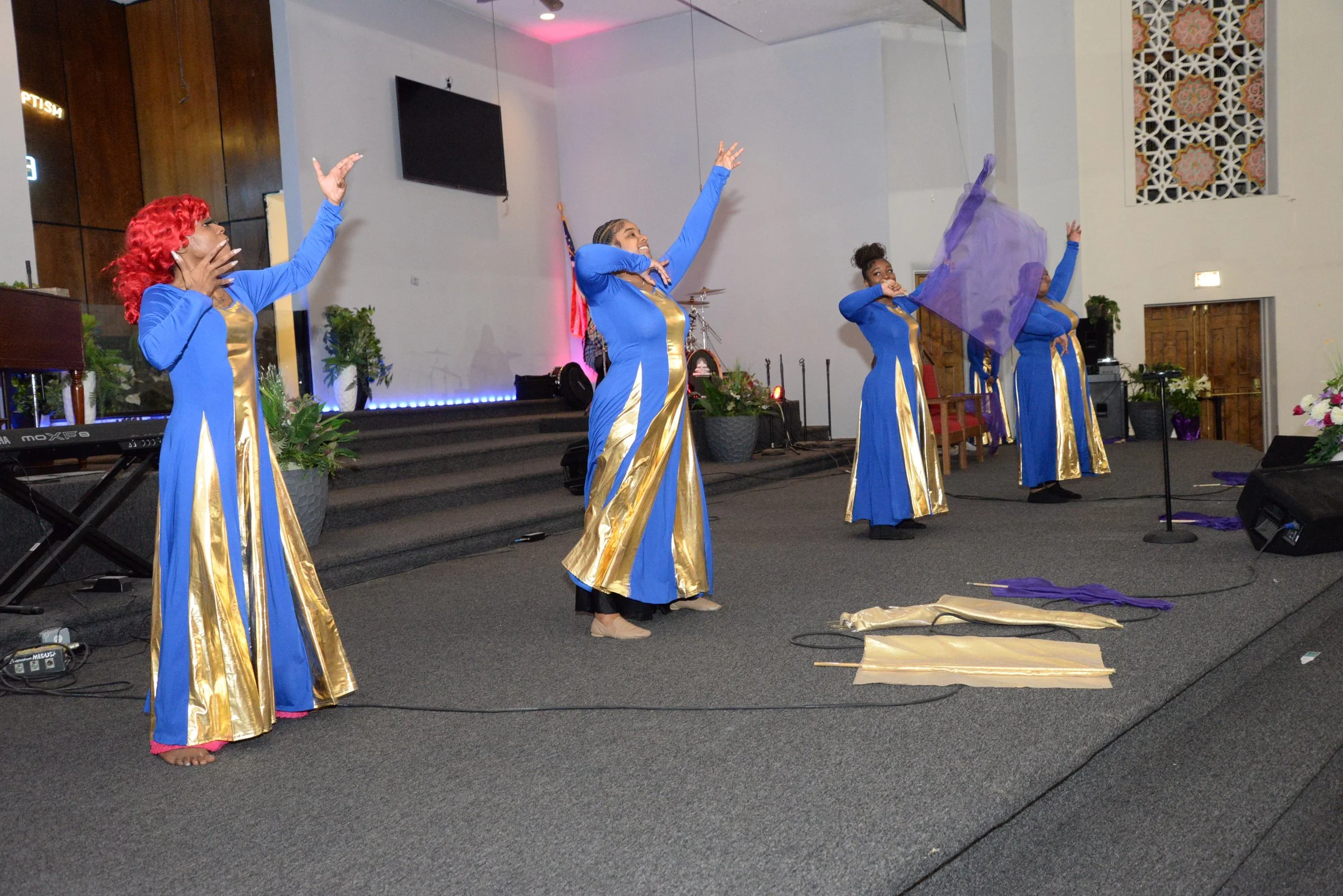Four women on stage in blue and gold dresses performing a dance or flag routine. They are holding purple flags, with one woman waving her flags high. The stage has musical instruments and plants, with a large screen and colorful wall decor behind the