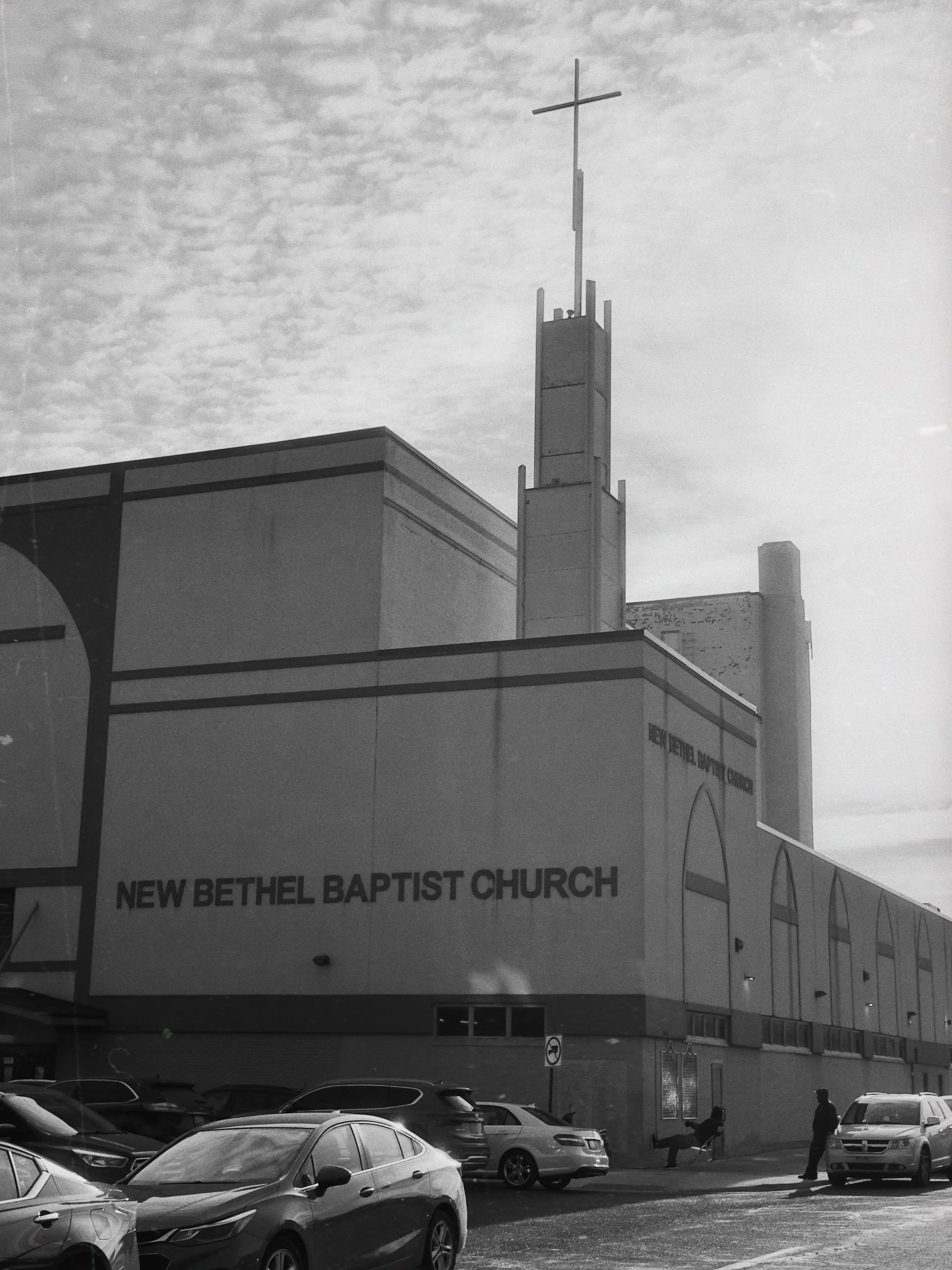 Exterior view of New Bethel Baptist Church, a large church building with a prominent cross on top, parked cars in the foreground, and a few people walking near the entrance, black and white photo.