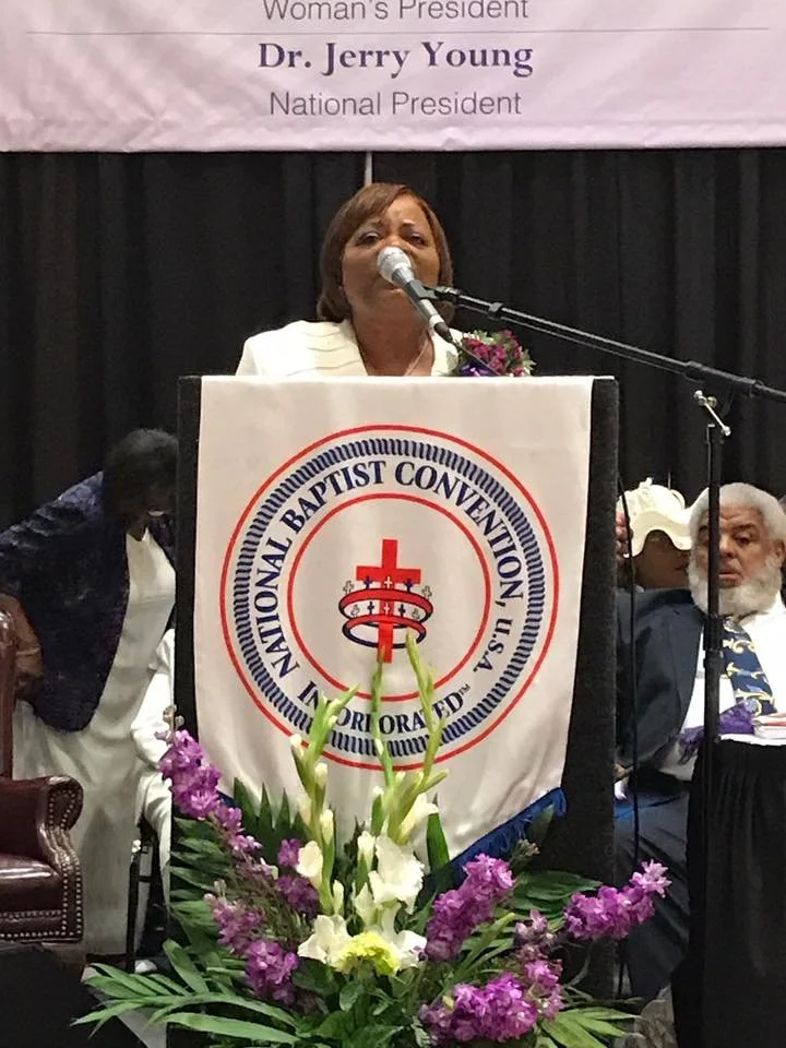 A woman speaking at a podium with a floral arrangement in front, a banner with the organization's logo, and a person in the background. The banner mentions Dr. Jerry Young, National President, and references the National Baptist Convention.