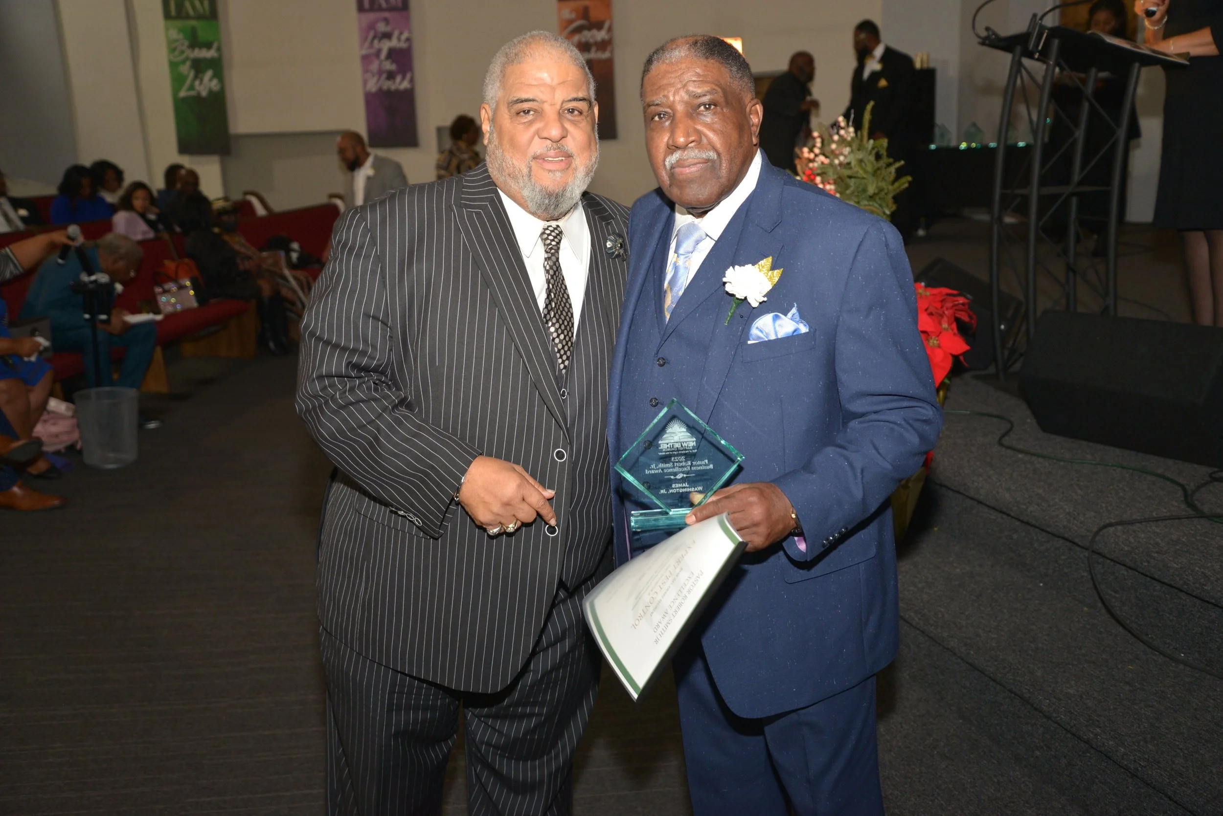 Two men in suits at an award ceremony, one holding a glass award and certificate, standing in a crowded event space with people and stage in the background.